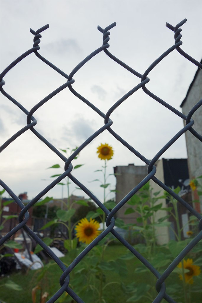 Taken at the very beginning and at the very end of the same walk, these photos seem to build up to a story. A story about two captive sunflowers, looking for the sun, and about the sun, itself fenced behind clouds, sending them a message of hope at the end of the day.